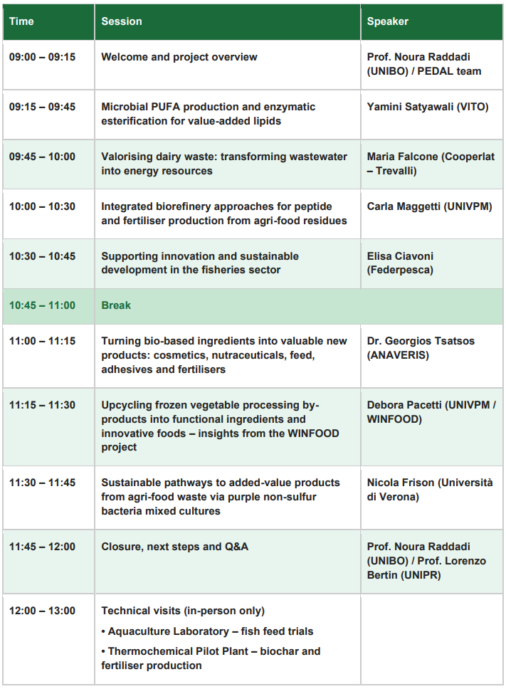 The conference will present intermediate results from our research, while sharing perspectives and initiatives between industry stakeholders and sister projects. The conference will feature contributions from the dairy, aquaculture and bioeconomy sectors. The morning will be followed by technical visits to UNIVPM laboratories and pilot plants.